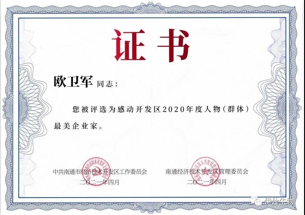 歐總是南通市中青年科學技術(shù)帶頭人,2020年度江蘇省企業(yè)“創(chuàng)新達人”,伊仕生物是南通市新冠肺炎疫情防控重點保障企業(yè)。