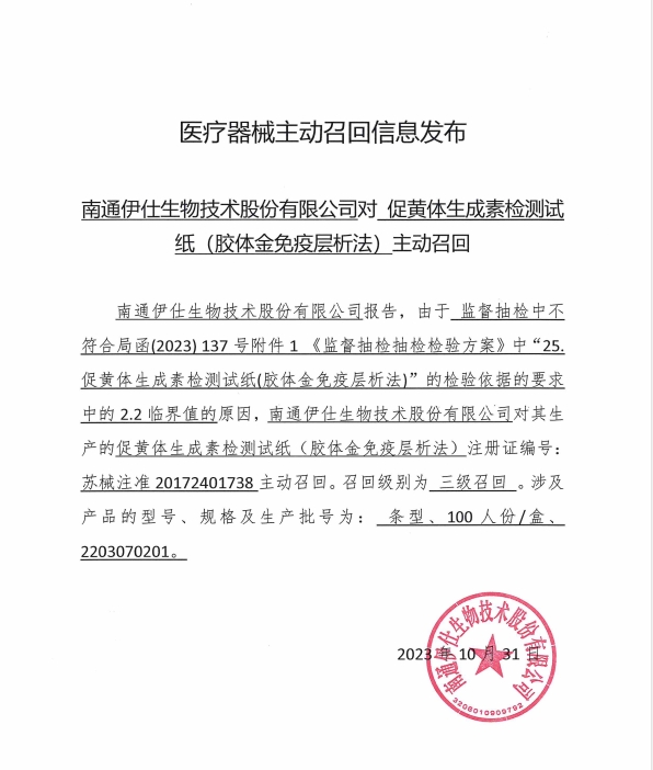 關(guān)于南通伊仕生物技術(shù)股份有限公司促黃體生成素檢測(cè)試紙(膠體金免疫層析法)產(chǎn)品的致客戶(hù)信