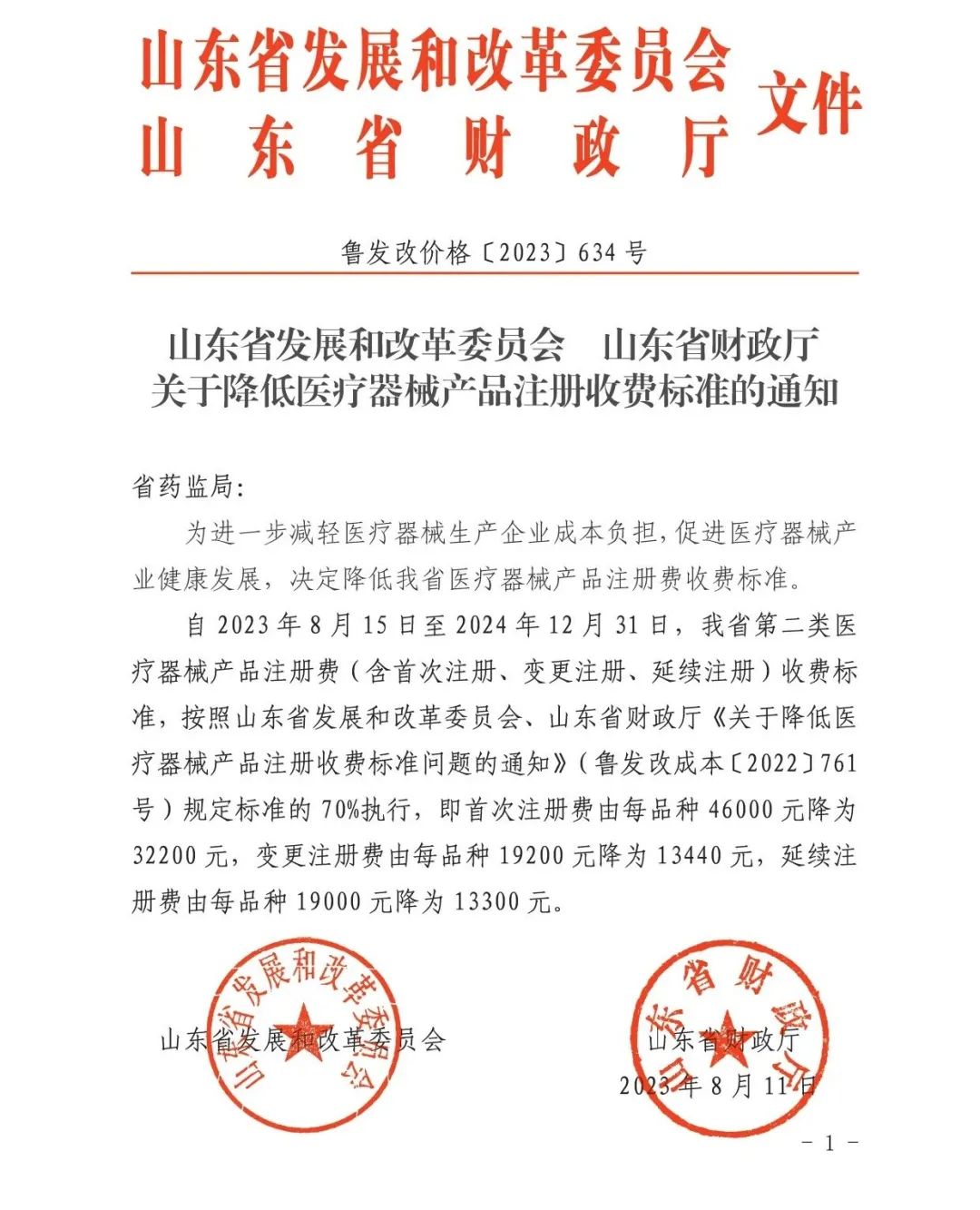 自2023年8月15日至2024年12月31日,我省第二類醫(yī)療器械產(chǎn)品注冊費(fèi)(含首次注冊、變更注冊、延續(xù)注冊)收費(fèi)標(biāo)準(zhǔn),按照山東省發(fā)展和改革委員會、山東省財(cái)政廳《關(guān)于降低醫(yī)療器械產(chǎn)品注冊收費(fèi)標(biāo)準(zhǔn)問題的通知》(魯發(fā)改成本〔2022〕761號)規(guī)定標(biāo)準(zhǔn)的70%執(zhí)行,即首次注冊費(fèi)由每品種46000元降為32200元,變更注冊費(fèi)由每品種19200元降為13440元,延續(xù)注冊費(fèi)由每品種19000元降為13300元。