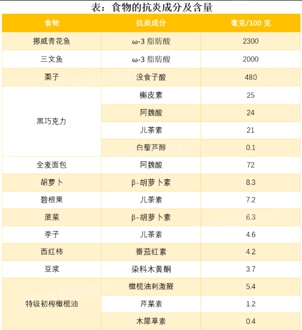 抗炎飲食可以改善體內(nèi)的炎癥因子,避免發(fā)展出疾病。比如:碳水化合物:推薦全谷物碳水化合物,比如藜麥、糙米、蕎麥、黑米等等。脂肪:多選擇單不飽和脂肪酸和多不飽和脂肪酸,比如魚(yú)蝦、貝類、亞麻籽油等含有多不飽和脂肪酸、歐米伽-3型脂肪酸。蛋白質(zhì):選優(yōu)質(zhì)蛋白質(zhì),如魚(yú)、家禽、雞蛋、瘦紅肉,以及低脂乳制品和大豆食品。蔬果:十字花科蔬菜和莓果類是最被推薦的“抗炎選手”。富含多酚、黃酮的食物:如綠茶、大豆等;香辛料:如姜黃、生姜、肉桂、肉蔻、大蒜等等在“抗炎飲食”榜上有名。⑥2023年5月國(guó)家注冊(cè)營(yíng)養(yǎng)師谷傳玲根據(jù)文獻(xiàn)研究,整理出了12種“抗炎王者食物”,供大家日常飲食中參考。